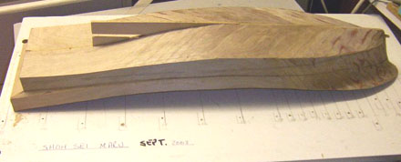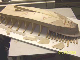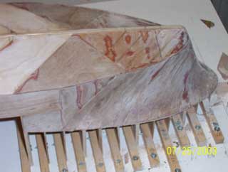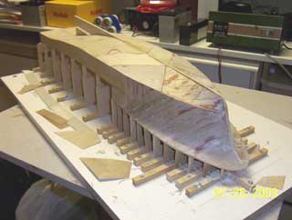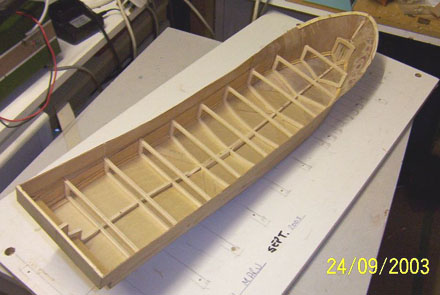 | 船体の合板貼付け作業の様子。 船首の曲線を出すためには、幅1センチ・厚さ0.8ミリの板の細切りを使用します。既に2枚ほど重ねてありますが、最終的には4枚ほど重ねます。 I am planking the hull in plywood and to get the curves at the bow I am using strips about 1 cm wide by 0.8millimetres thick, so far I have used 2 layers but will have 4 layers in total. |