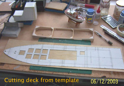| テンプレート(型紙)を用いた甲板の切り出し フィリップさんの作業デスクの様子もご覧ください。 |