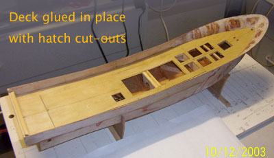 | 甲板の船体への接着 甲板に開いている穴は水槽や船倉の開口部分です。模型だとフタして終わりなので、わざわざ開ける必要はないように思えるのですが、そこはフィリップさんのこだわりなのでしょう。 |