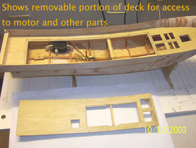 | 動力系へのアクセスのための取り外し可能な甲板部 モーターやサーボの調整や、バッテリー交換のために甲板中央が大きく取り外せるようになっています。 取り付けられるモーターは、フィリップさんがいつも使っているSwiss Military motors製のボールベアリング付きのもので、十分にパワフルだとのことです。 |