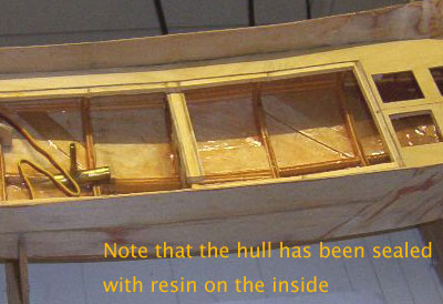 | 防水加工された船内 外側だけでなく船内も、防水のための樹脂が塗られているのが判ります。 |