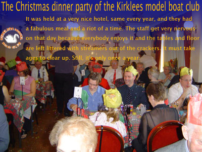 | カークリーズ・モデルボートクラブのクリスマス・パーティ 毎年、ドゥーズブリーの豪華なホテルで開かれるクリスマス・ディナーの様子です。パーティはやっぱり、ご馳走を食べながらのどんちゃん騒ぎとのこと。どこでも同じですね。 パーティでは、会長であるフィリップさんがスピーチをして、クラブを手伝ってくれたメンバーのご夫人に花束を渡し、その奥さん一人一人からキスしてもらったそうですが、何人くらいからキスしてもらったのでしょうか? 素晴らしい役得ですね。ウチのクラブも始めましょうか? |