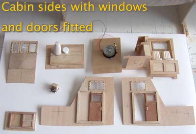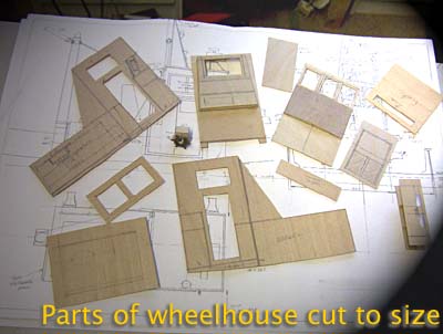 | 切り出された操舵室の各部品 ちょっと判りにくいですが、中央やや左に舵の舵輪が見えます。 本物はこれを廻して、油圧で舵を動かします。 |