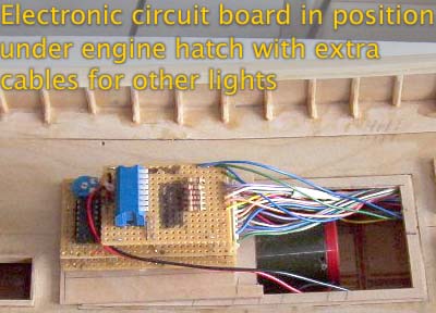 | 据え付けられた電子配電盤 操舵室後部エンジンハッチ下に据え付けられた電子配電盤と、その他の電球を点灯させるための配線類です。なんかすごい数なんですが・・・。 |