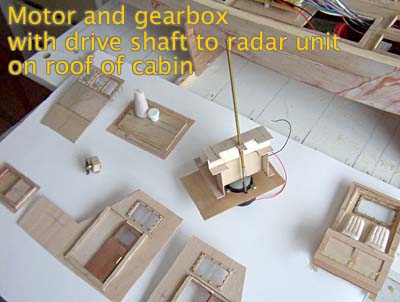 | レーダーのギミック レーダーはディスプレイが光るだけでなく、操舵室上のアンテナが回転します。モーター、減速ギアボックス、それに回転を伝えるシャフトがついたユニットが見えます。 |