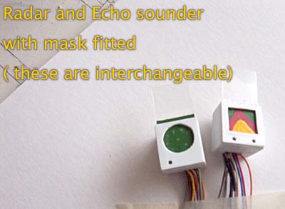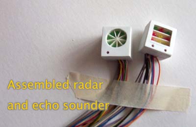 | 組み立てられたレーダーと 魚群探知機の受像機(ディスプレイ) レーダーは時計廻りにLEDが次々に光り、魚探は赤青黄色のLEDが波打つように光ります。 |
