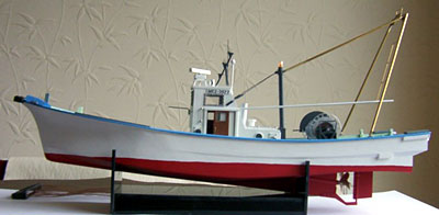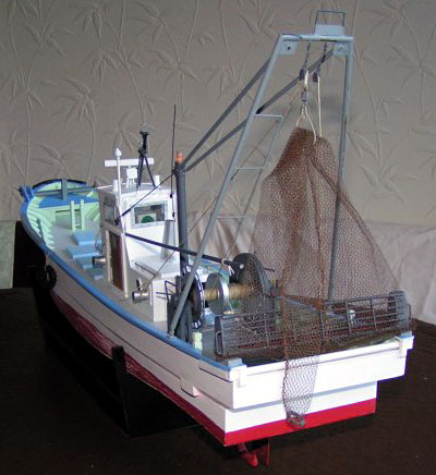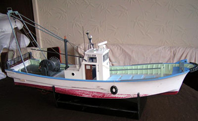 | 船尾に漁具を載せた状態。 これまた実物そっくり。見慣れた姿が再現されていて、妙な気分になってきます。 漁具のロープなども実物と同じように施されています。 |