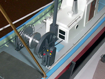 | フィリップさん苦心のウィンチ廻り。 一番右のリングにかぶせられたグレーのカバーは、ブレーキに水かかからないように、後から親父がFRPで取り付けたものですが、それも再現されています。 その右の黄色と赤の小さい突起は、作業場でウィンチと船を操作するためのクラッチとスロットルです。 |